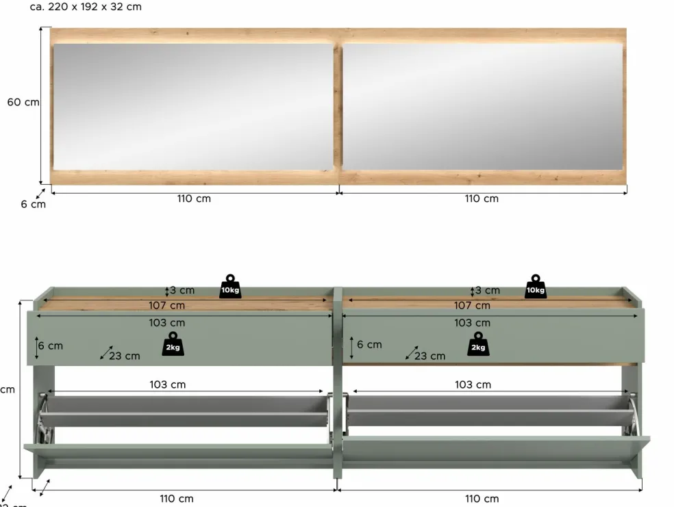 2 meubles à chaussures avec, chacun, 1 tiroir, 1 abattant et 1 rangement pour chaussures, à suspendre