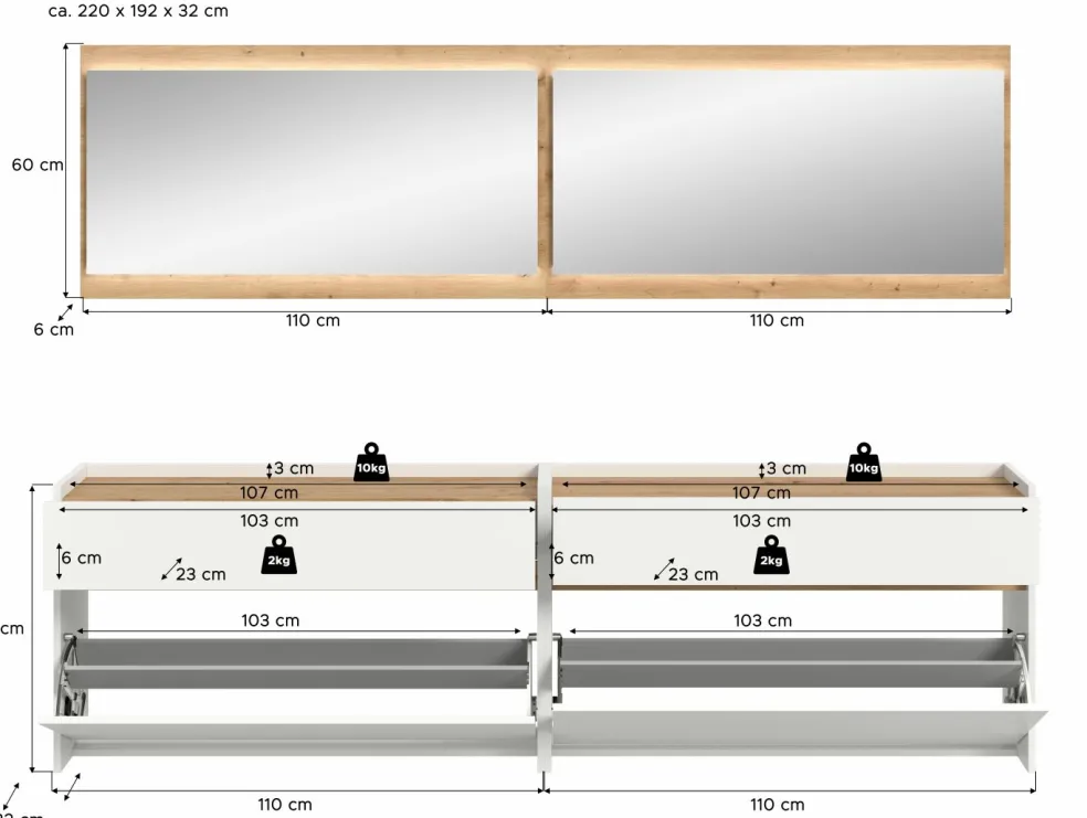 2 meubles à chaussures avec, chacun, 1 tiroir, 1 abattant et 1 rangement pour chaussures, à suspendre