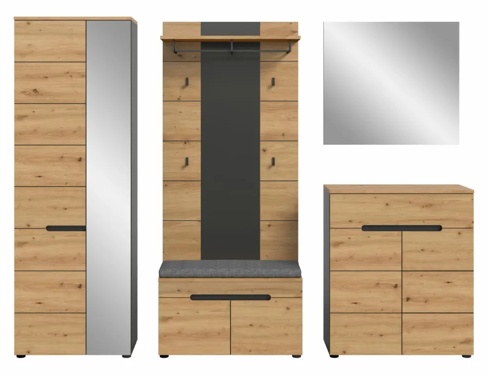 1 armoire d’entrée avec 2 portes (dont 1 porte avec miroir), 1 tablette fixe, 1 barre de penderie et 4 tablettes amovibles