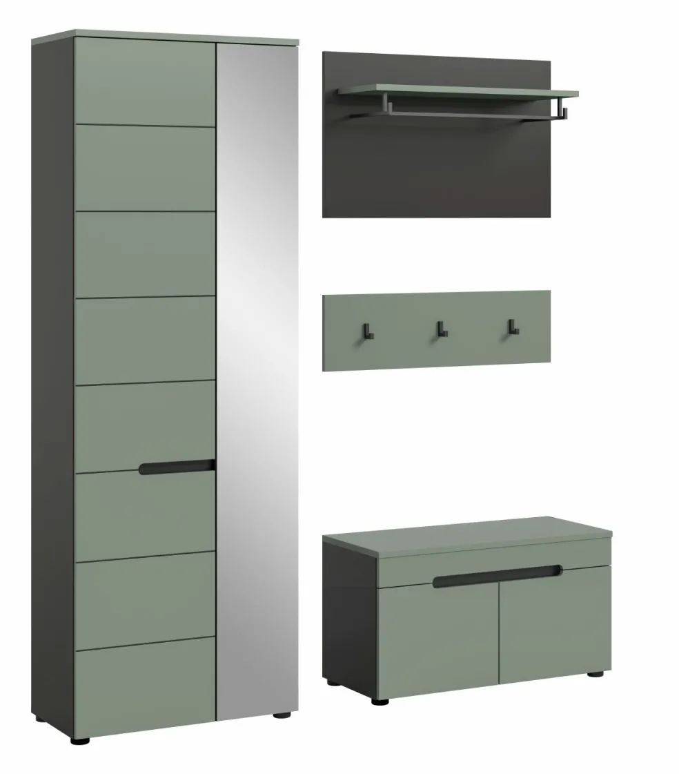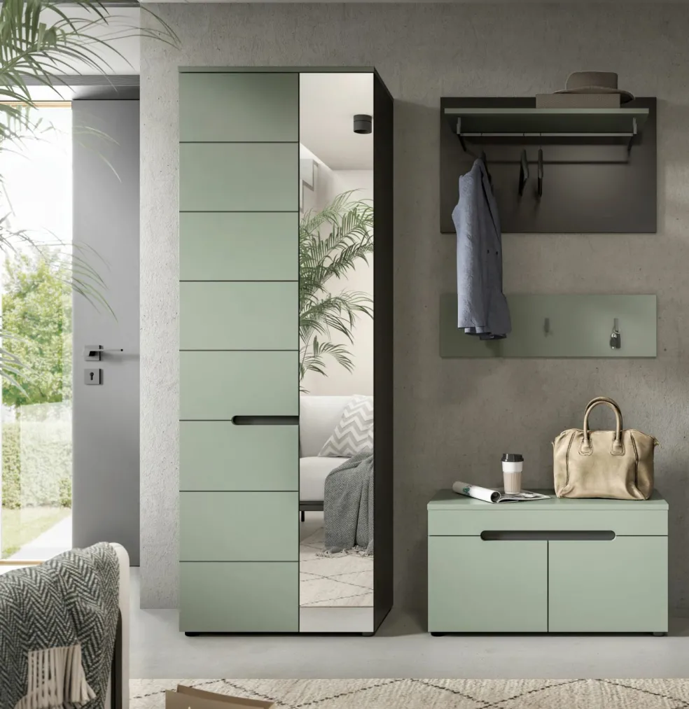 1 armoire d’entrée avec 2 portes (dont 1 porte avec miroir), 1 tablette fixe, 1 barre de penderie et 4 tablettes amovibles