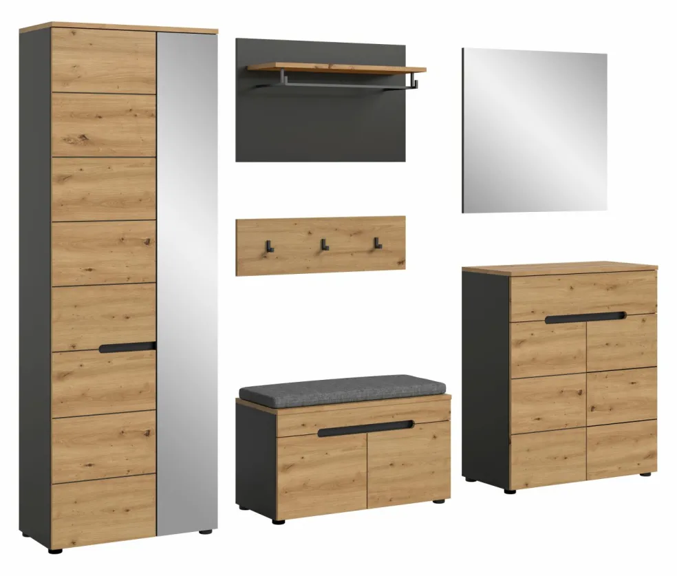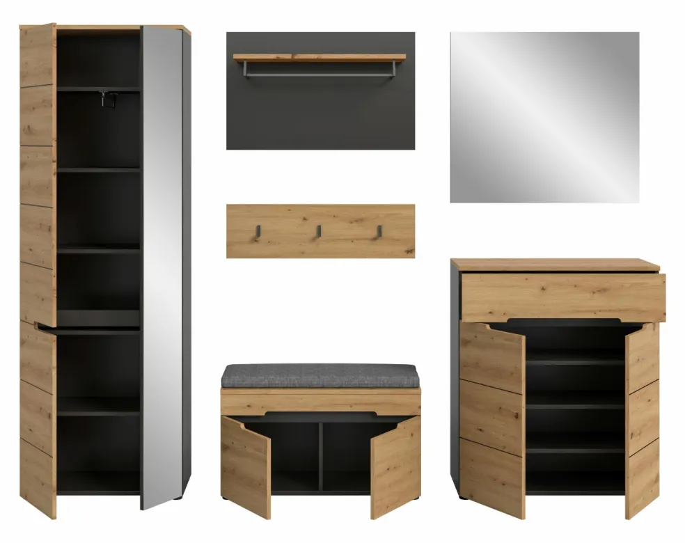1 armoire d’entrée avec 2 portes (dont 1 porte avec miroir), 1 tablette fixe, 1 barre de penderie et 4 tablettes amovibles