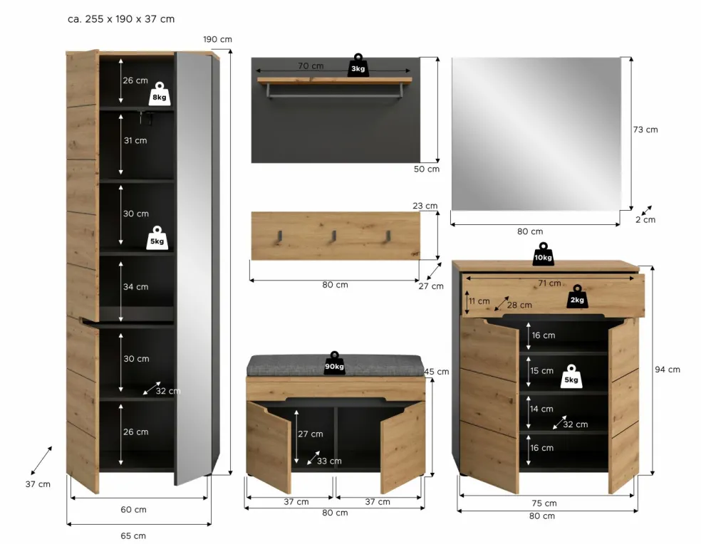 | Dimensions : | L/H/P env. 255/190/37 cm | ||