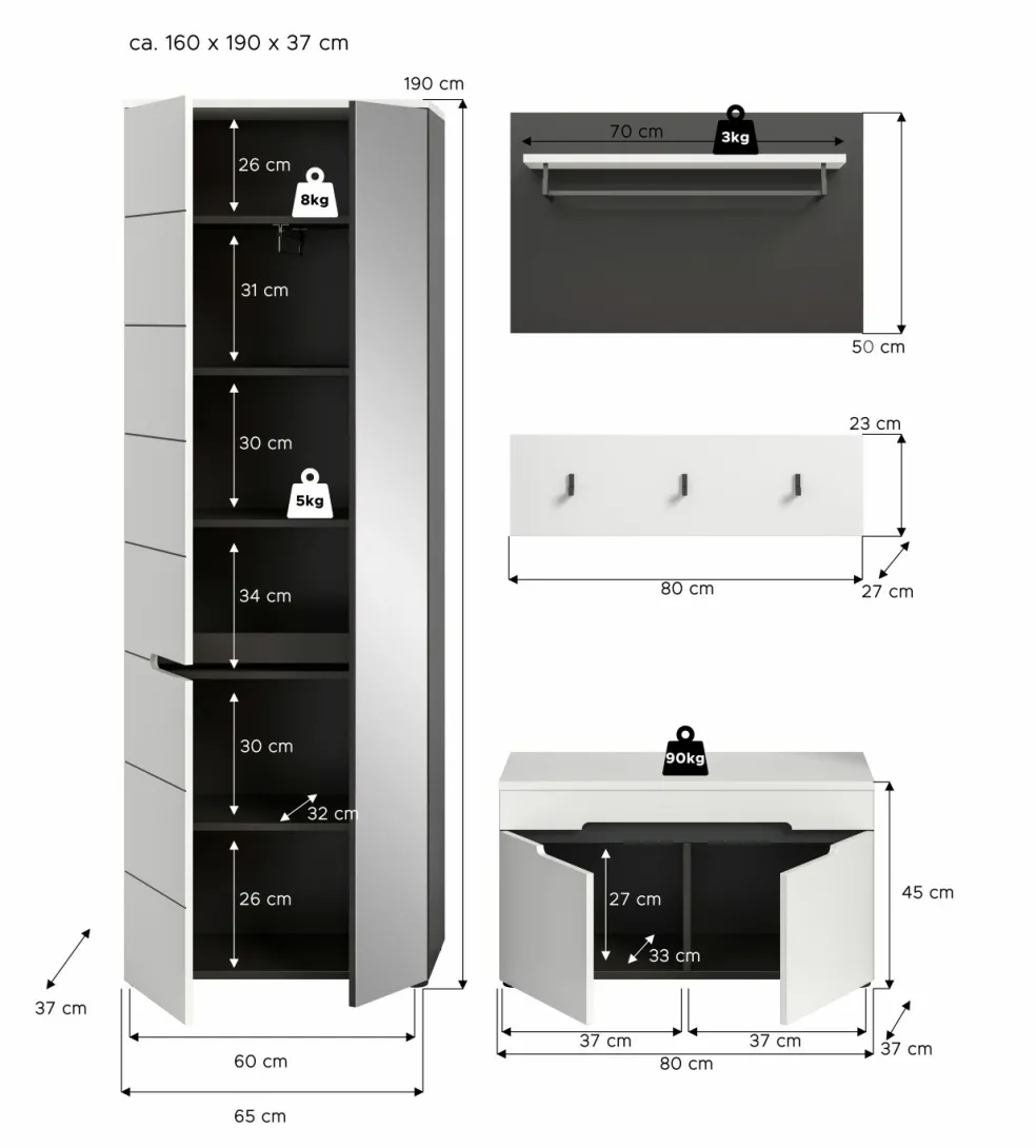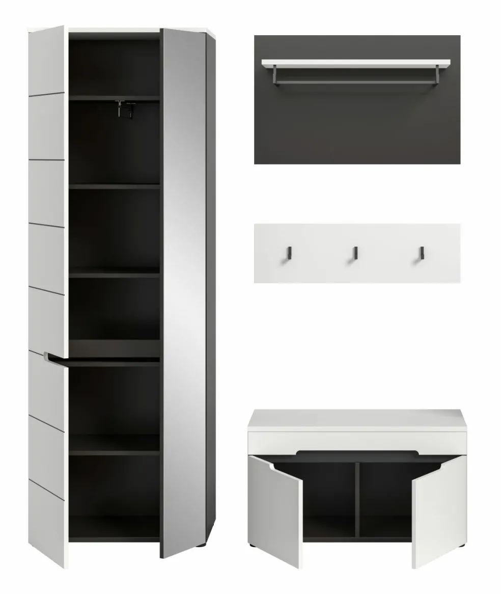 1 armoire d’entrée avec 2 portes (dont 1 porte avec miroir), 1 tablette fixe, 1 barre de penderie et 4 tablettes amovibles
