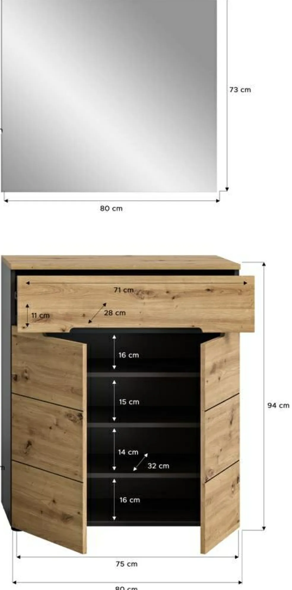 1 meuble à chaussures avec 2 portes, 1 tiroir et 3 tablettes amovibles